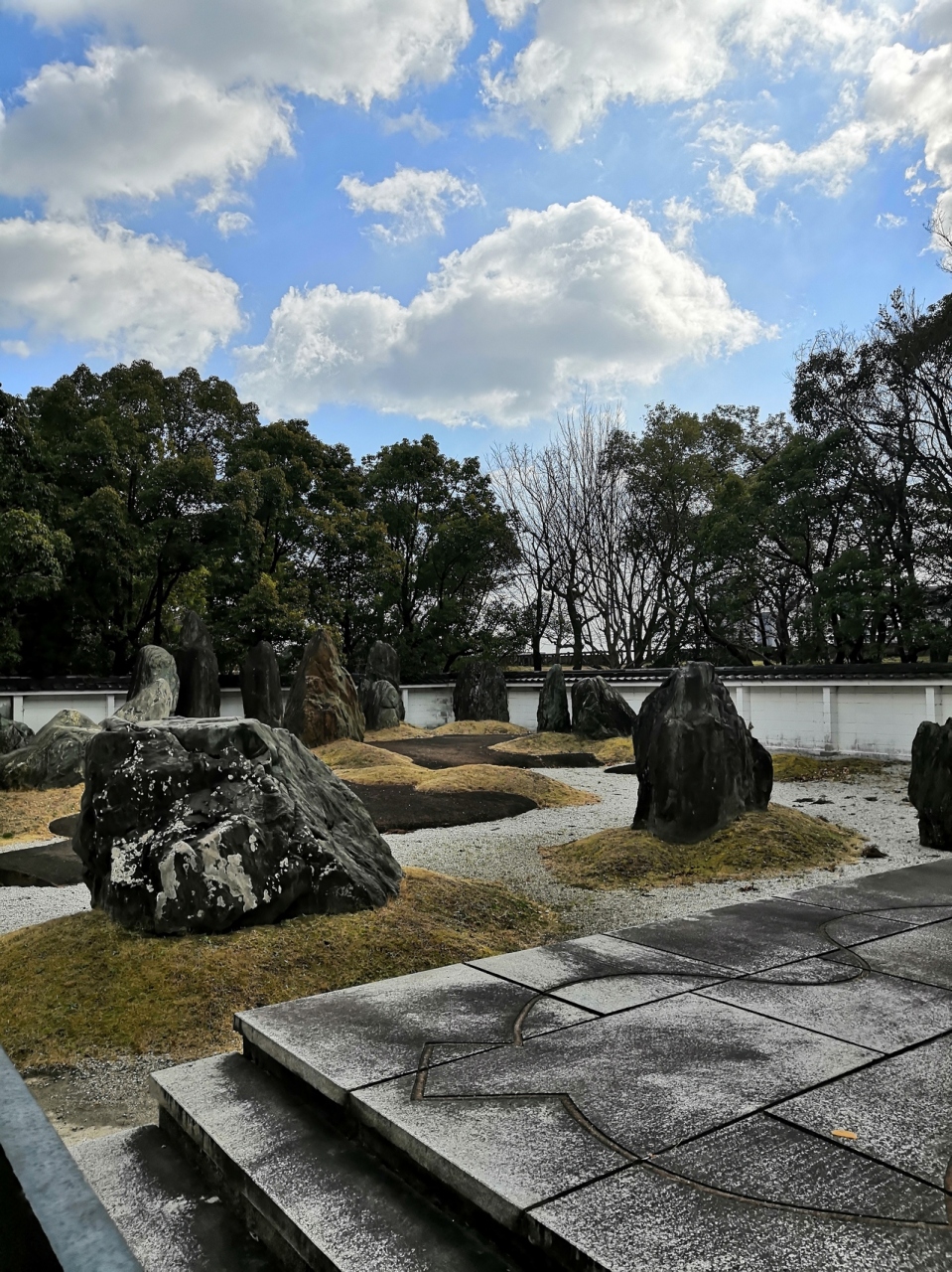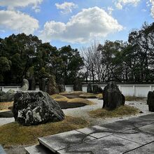 豊國神社の本殿に沿ってすすんだ奥にあります。見学者はいなく、ひっそりとしていました。重森三玲によって作庭された枯山水庭園です。一応柵がありますが、塀が低いので普通に眺めることができます。説明文は劣化してほぼ読めませんが、庭園見るだけで十分です。
