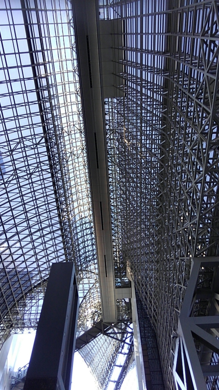 京都駅ビルは巨大な吹き抜けのちょっと近代的な建物になっています。古都京都を思っていると全く違う建物にある意味期待を裏切られ圧倒されます。長く続いているエスカレーターを上っていくと京都駅周辺が一望できます。飲食店、土産店、ホテル色々にぎやかな京都駅ビルです。