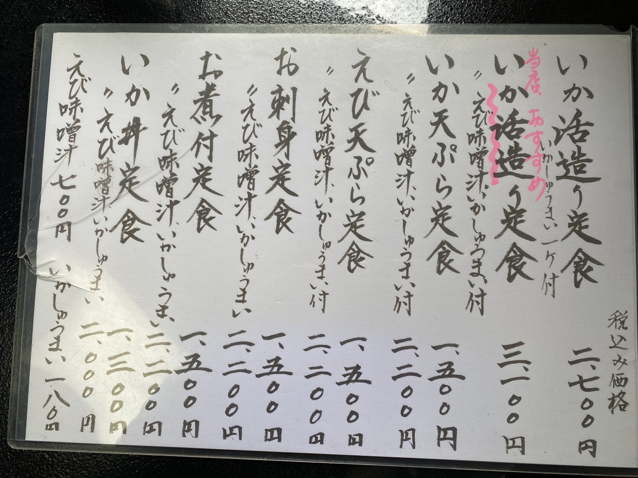 海老の味噌汁は必要ないので、私はイカ活き造り定食、家内はイカ天ぷら定食にしてシェアしました。活き造り定食は最後で目ん玉周囲とか天ぷらにしてくれたので、天ぷら定食にしなくても良かったなぁー。オーダーする時に言ってくれたら良いのにと感じました。