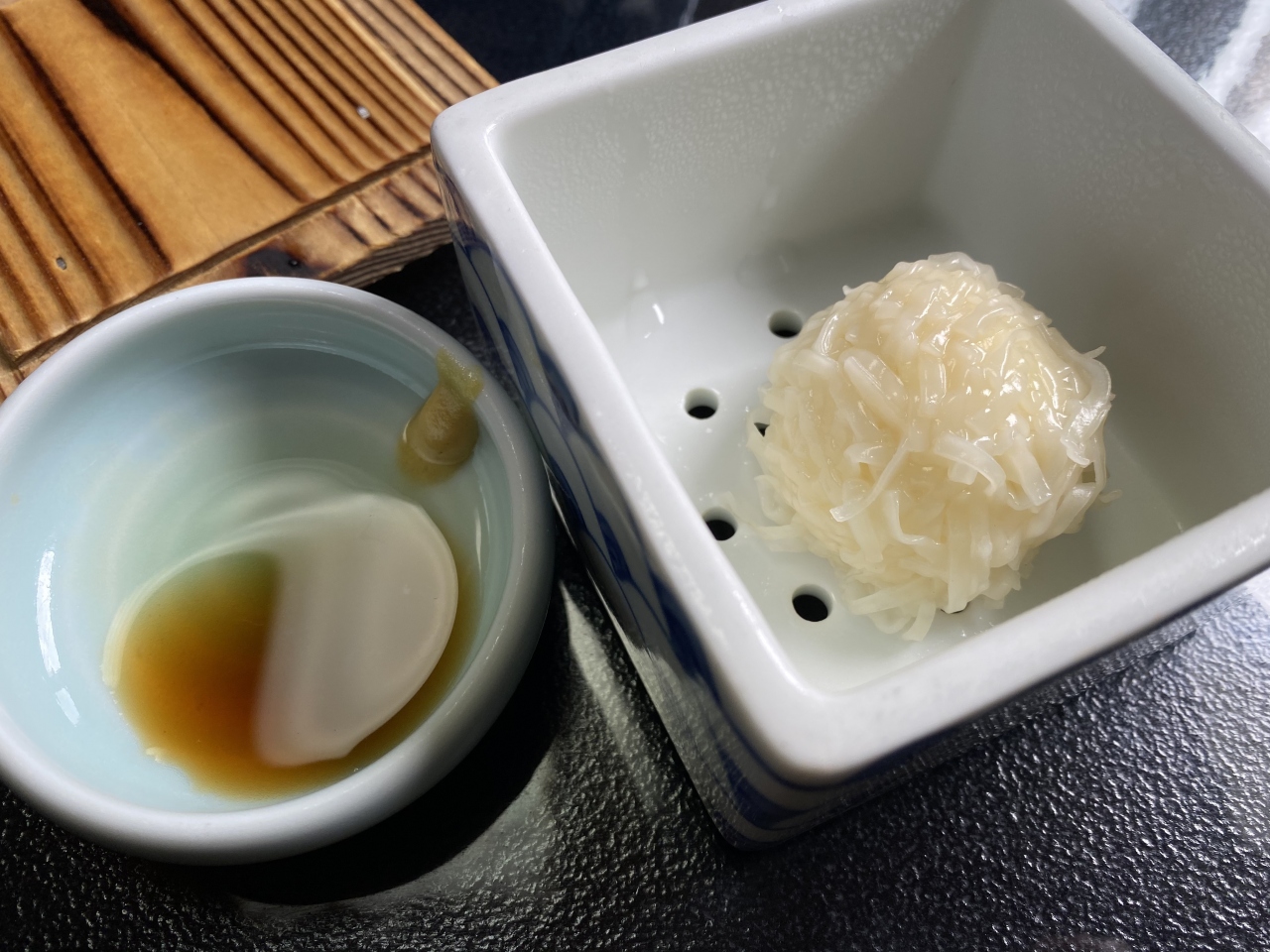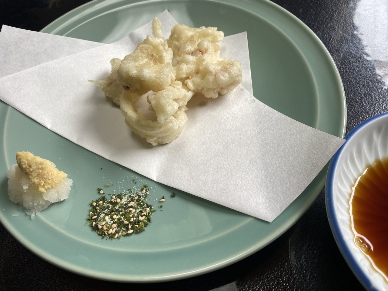 活き造りなので、出てきた時は少しまだ動いてます。なのでコリコリ感はありますが、呼子のイカはモチモチ感は足りないように思うのです。(個人的感想ですが、福岡の生簀料理店や大阪の鮨屋とかで、もっと美味しいのを食べました)