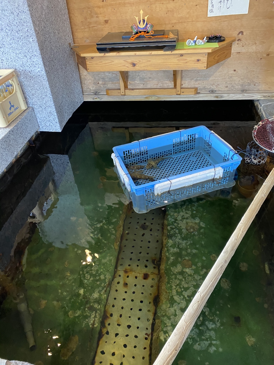 以前に呼子で食べた時も、特別美味しかった印象はなかったので、呼子までは行かず、名護屋城跡を見に行くのに便利なこのお店にしました。中に入ってすぐの生簀にはイカは見当たりませんでしたけど・・・。生は何処にいるのか ?