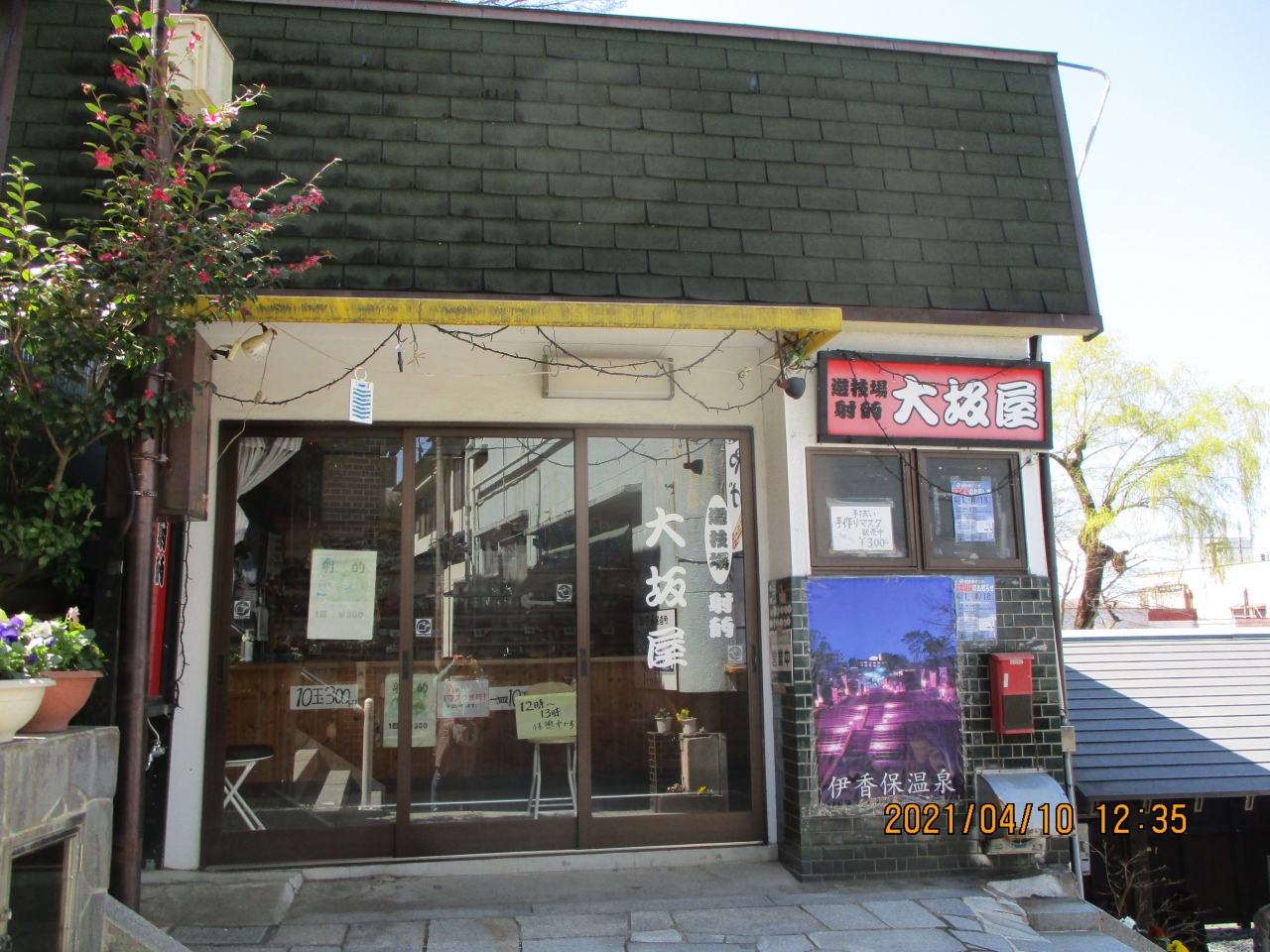 伊香保温泉の石段街を歩いていて、中間くらいのところにありました。射的と書いてあって、足を止めたのですが、中にいる女性と目が合いましたが、よく見るとガラスの扉が閉まっていて、そこには12時から13時まで休憩中と書いてありました。