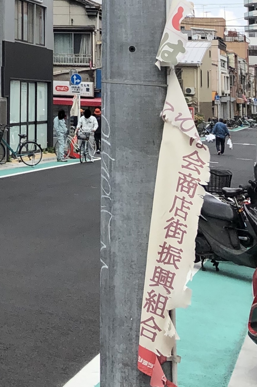 「いろは会商店街」と書かれたハタもビリビリ状態。
