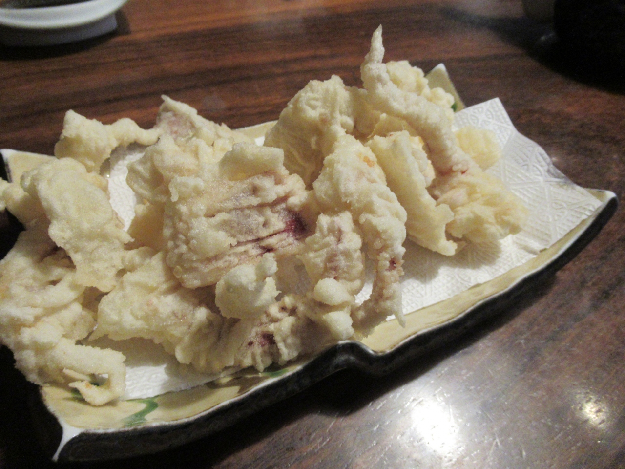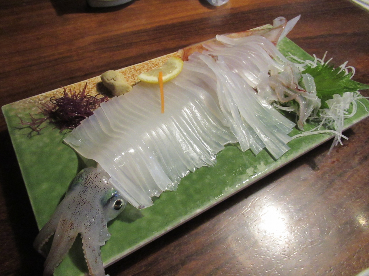 メニューを見ると、定食ばかり。お酒のおつまみを、と思っても、ちょうど良い料理がなくて困りました。名物のイカは生簀から取ってきたものを一匹。お刺身で食べた後、残りを天ぷらにしてもらいました。二人で一匹食べたら、お腹いっぱいになりました。
