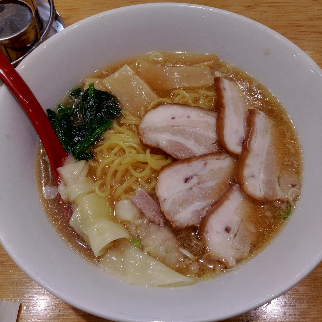 チャーシューワンタン麺をいただきました。ワンタンてるつる、スープはこくのある醤油味でおいしかったです。