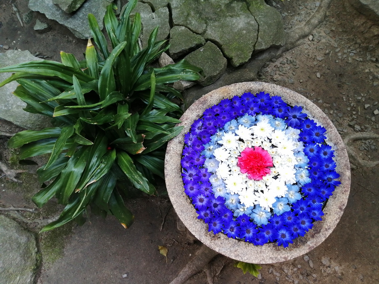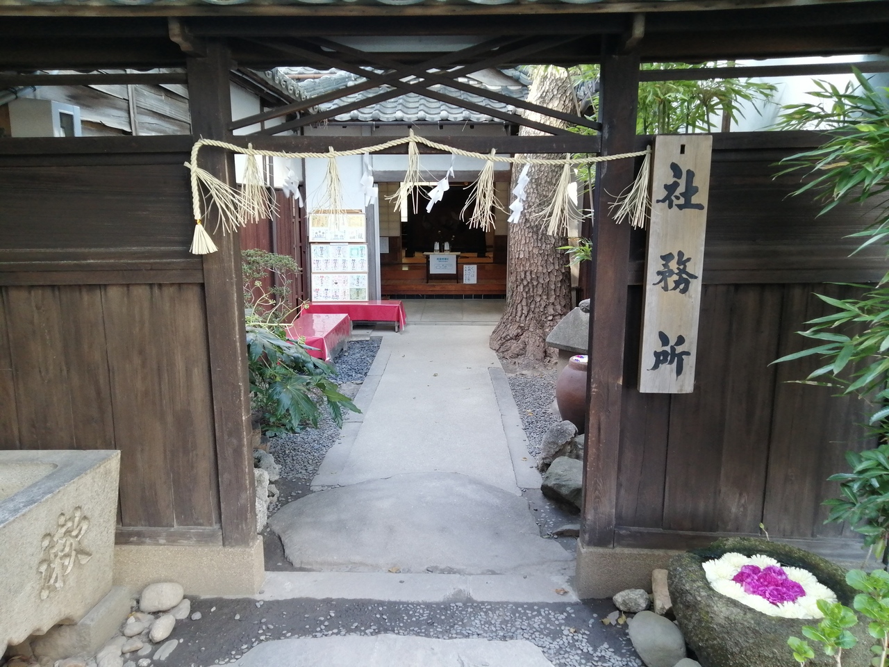 岡崎最古の神社。日本武尊(ヤマトタケル)の命により西暦110年に創建されたと言われています。とてつもなく由緒のある神社ですが気軽に楽しむこともできます。拝殿向かって左奥の社務所内の一画に花手水(はなちょうず)が置かれています。花手水とは神社やお寺の手水(手を清める水)鉢に花を浮かべたもの。授与所に一声かけてから見に行きました。