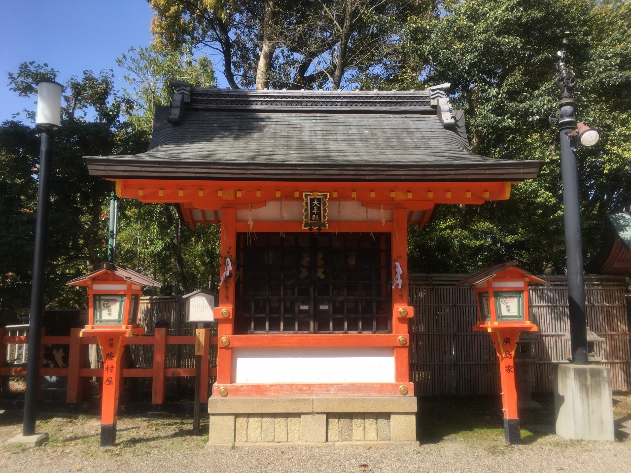 八坂神社の末社で、本殿の西側すぐのところにあります。朱色が綺麗なこじんまりとした社です。向かって右手には十社があります。大年社は祇園古宮とも呼ばれ、例祭日が節分の日であることから「節分の神」とも言われています。祭神は、「大年神」と「巷社神」です。大年神は穀物守護の神であり、祇園一帯の農耕の神して祀られてきました。