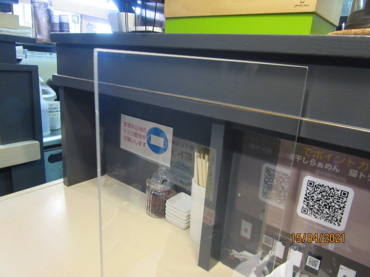 アクリル板設置、マスク装着掲示あり。最初なので一押し煮干しラーメン750円を購入。