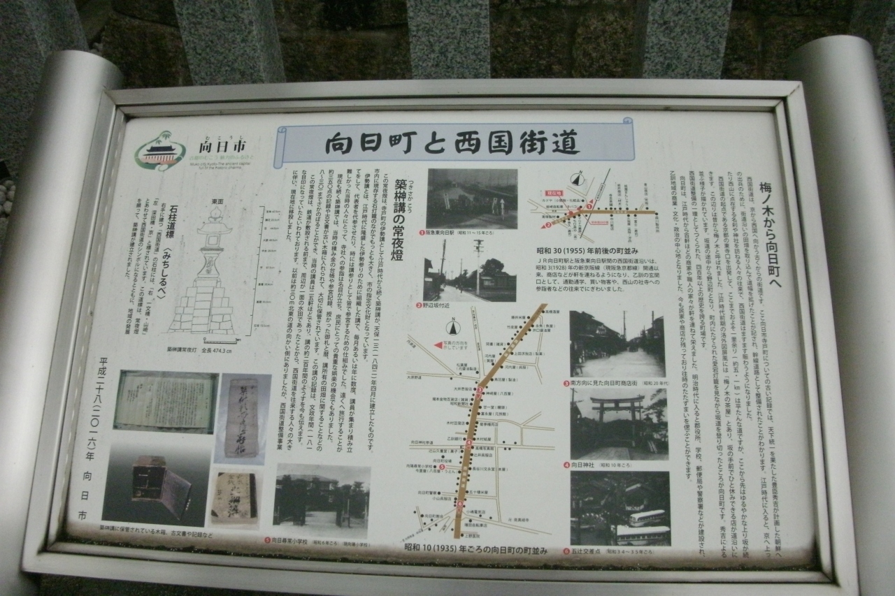 向日市内史跡巡りで訪れました。阪急東向日駅西側出口より南西へ歩いてすぐのところにあります。現地にある説明板によると天保13年(1842年)に伊勢参りの講の一つである築榊講の人々によって建てられた灯籠で、向日市指定文化財になっているそうです。