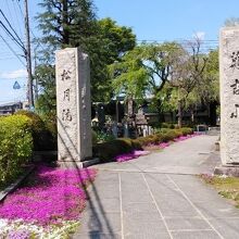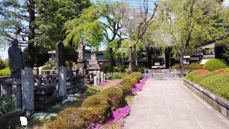 山門に至る参道には芝桜が咲き、境内にはツツジの花が咲くなど、季節の花が印象的な寺院だった。桜の木もあったので、開花時期は絵になる風景だと感じた。広々とした境内はしっかりと管理された庭園で落ち着いた環境だった。