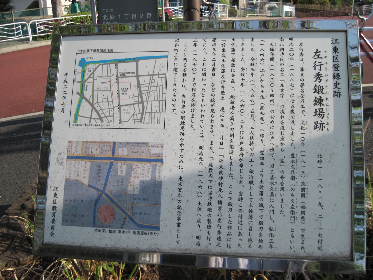 このあたりが江戸時代の土佐藩下屋敷跡ということで、左行秀の石碑と案内板が設置されていました。あまり刀鍛冶と縁がありませんが、当時は武士は必ず刀を所持するので、腕の良い刀鍛冶は大切にされたのだろうと思いました。