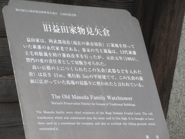 萩の観光で訪問しました。石の上に立っている建物で木の壁の上に漆喰がありました。結構丈夫そうな建物です。矢倉といって、もともとは武器を収納するための建物だそうで、見張りも兼ねていたので「物見矢倉」という名称とのこと。萩城を見張る重要拠点の一つだったのですね。今は住んでいる方がいらっしゃるようで、外観のみの見学です。案内板もありました。