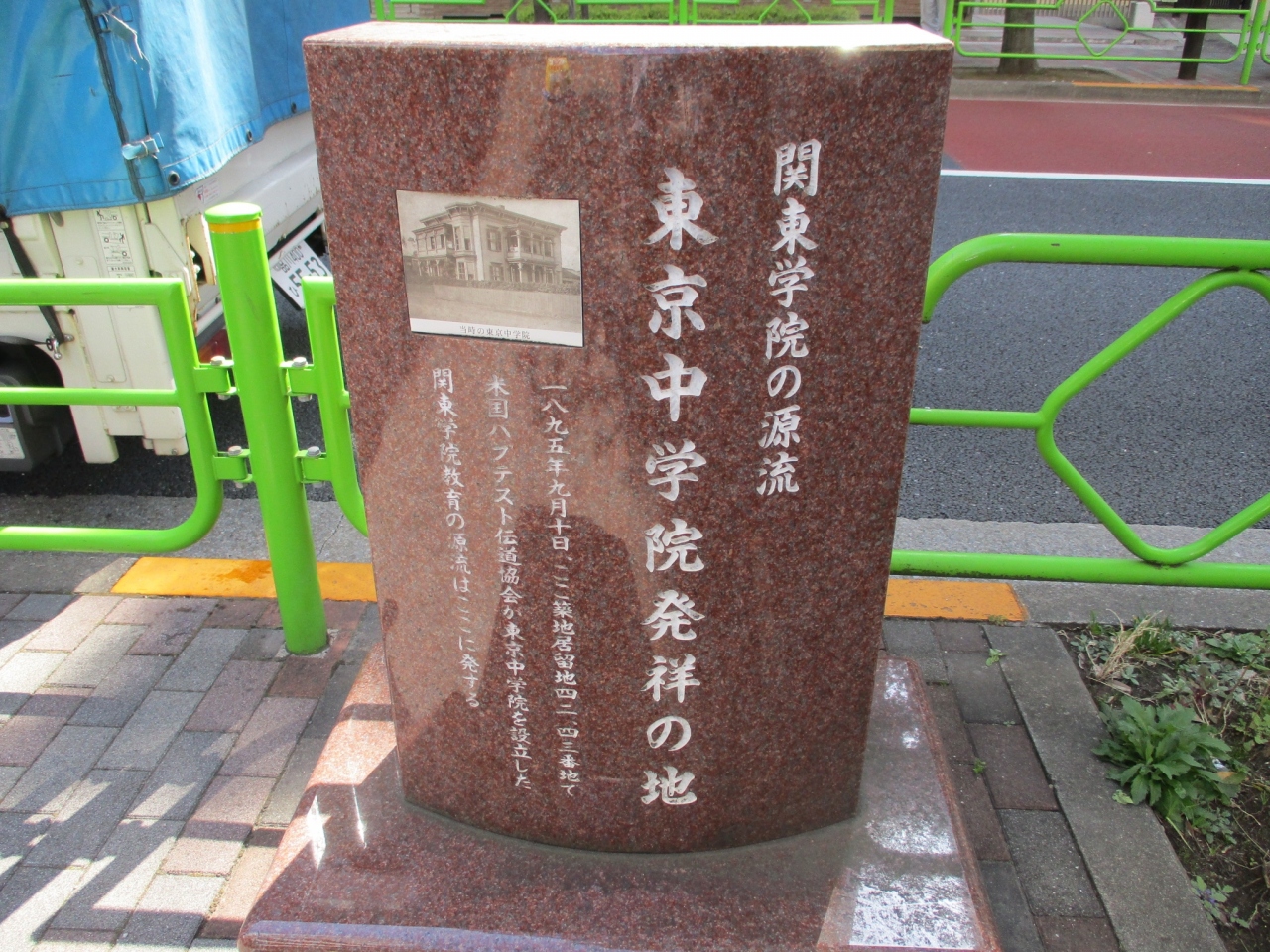 築地はかつて外国人居留地があったためミッションスクールなどの学校碑がたくさんあります。こちらの碑は明石小学校の近くにあります。色が独特で目立ちます。当時の校舎の写真がわかるようになっています。関東学院のルーツとなった学校です。昔いろんな学校の若い学生が通っていた場所と思うと不思議な感じがしました。