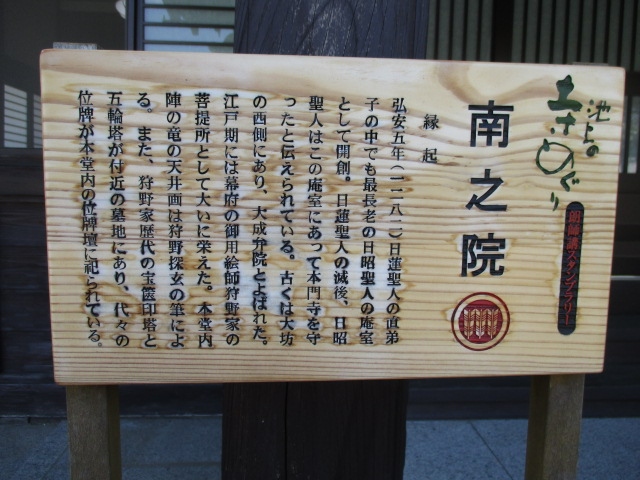 池上本門寺本殿から日蓮上人入滅の地へ向かって大坊坂を下ると左側に南之院に着きます。1282年に日蓮聖人の直弟子の日昭聖人の庵室として建てられたお寺とされています。立派な山門をくぐると広い境内の緑豊かな日本庭園と質素な立派な本堂が印象的で見ごたえありまのでお勧めです。 古い鬼瓦も見ごたえあります。