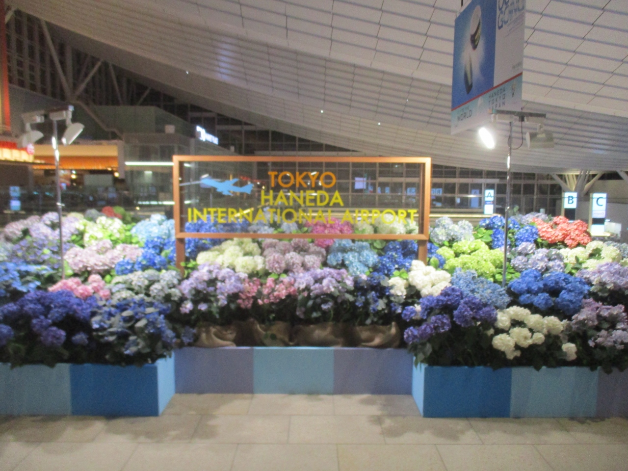 6月の羽田空港には紫陽花の飾りが施されていました。メイン通りだけでなく、あらゆるポイントに赤、白、ピンク、黄色の花が咲いており、見学だけでも楽しむことができました。6月は2回利用しましたが、今回は夜でライトアップされてきれいでした。