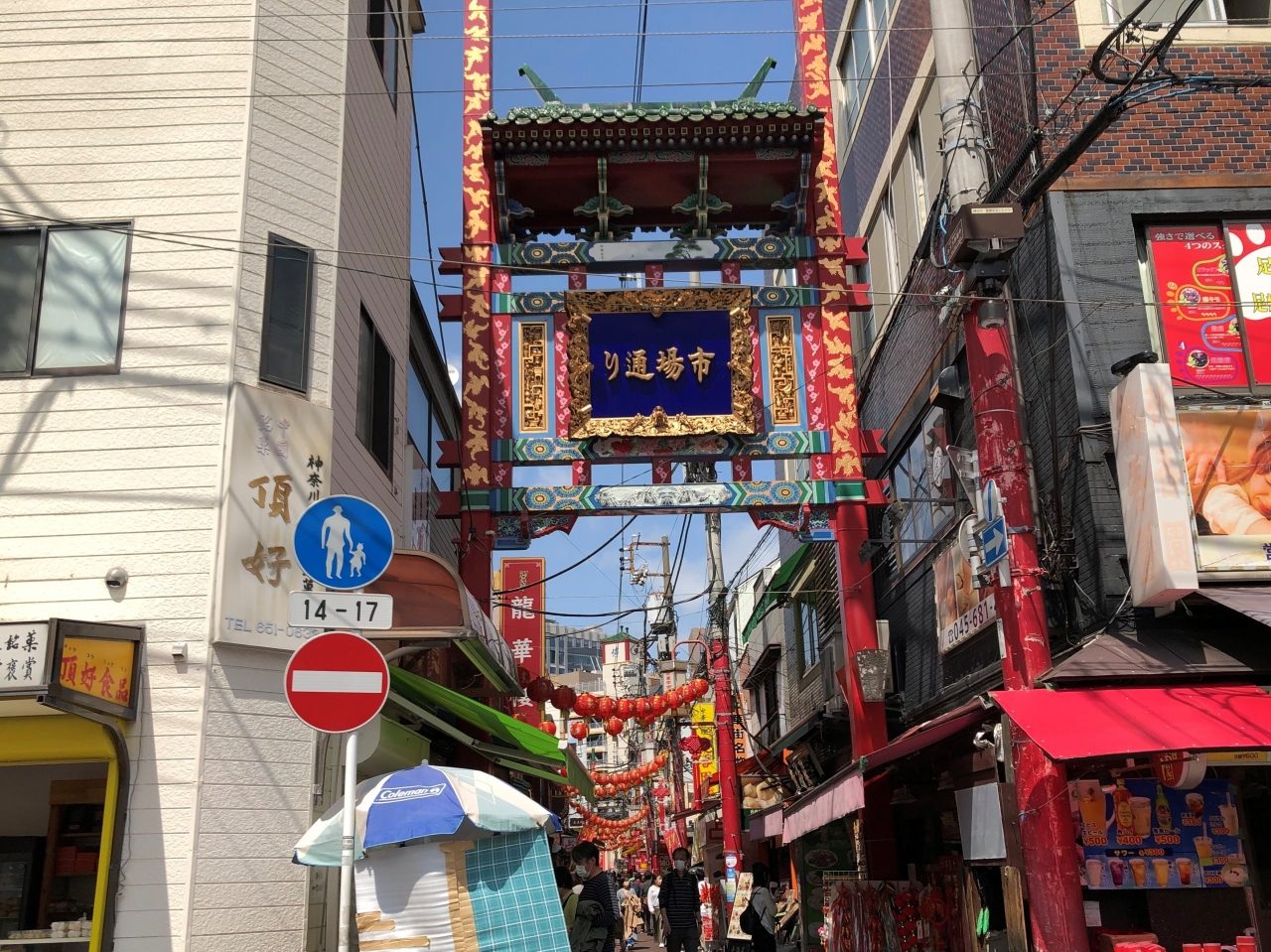横浜中華街の中、南北に細い道(市場通り)が通っています。通りの両端、中華街大通りと関帝廟通りに、色鮮やかな市場通り門が建っています。ちなみに市場通りは、中華街大通りから、本町との境にある堀川沿いの市場通り交差点まで、約300mの通りです。