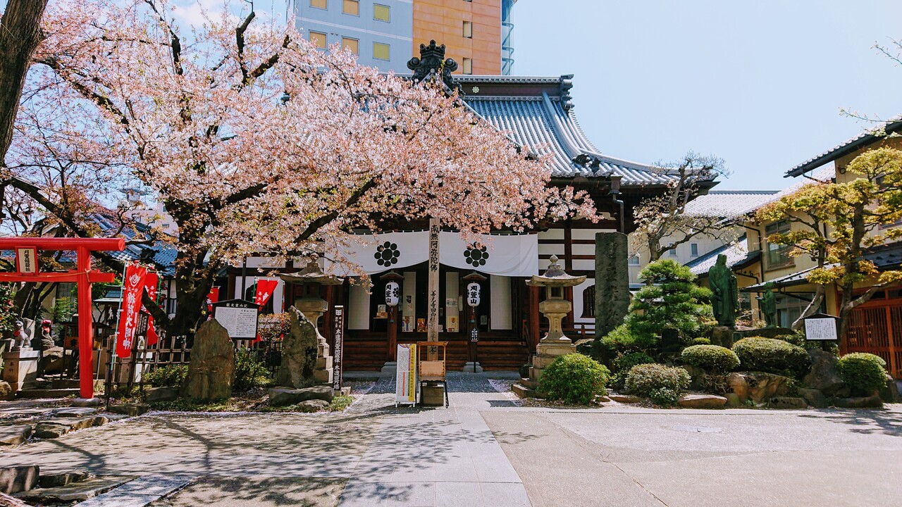 ホテルや商店に囲まれた中にこじんまりとしたお寺ですが、古い瓦葺きのお堂と、その目の前に立つ桜の木がとても絵になりました。