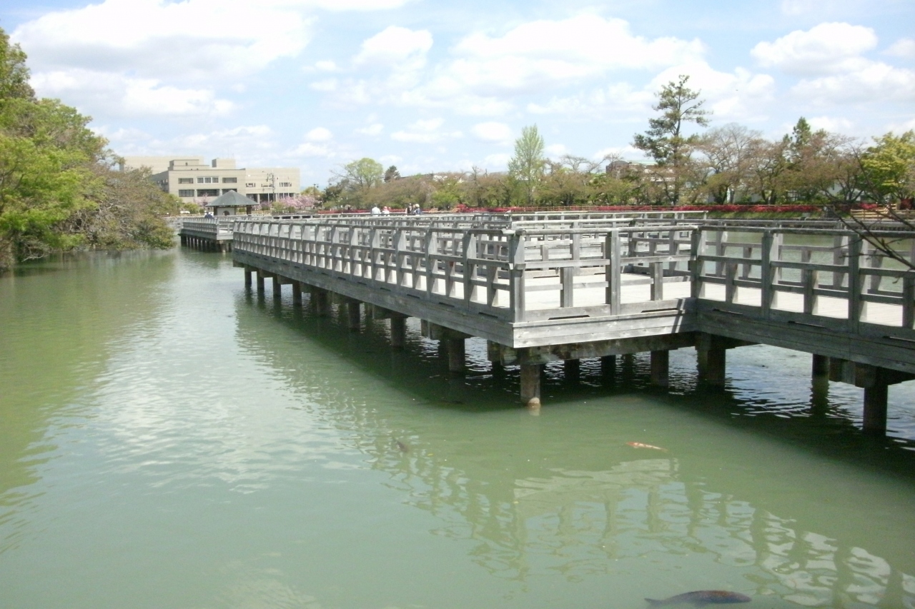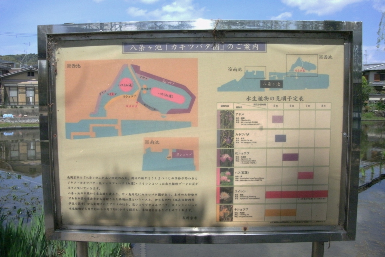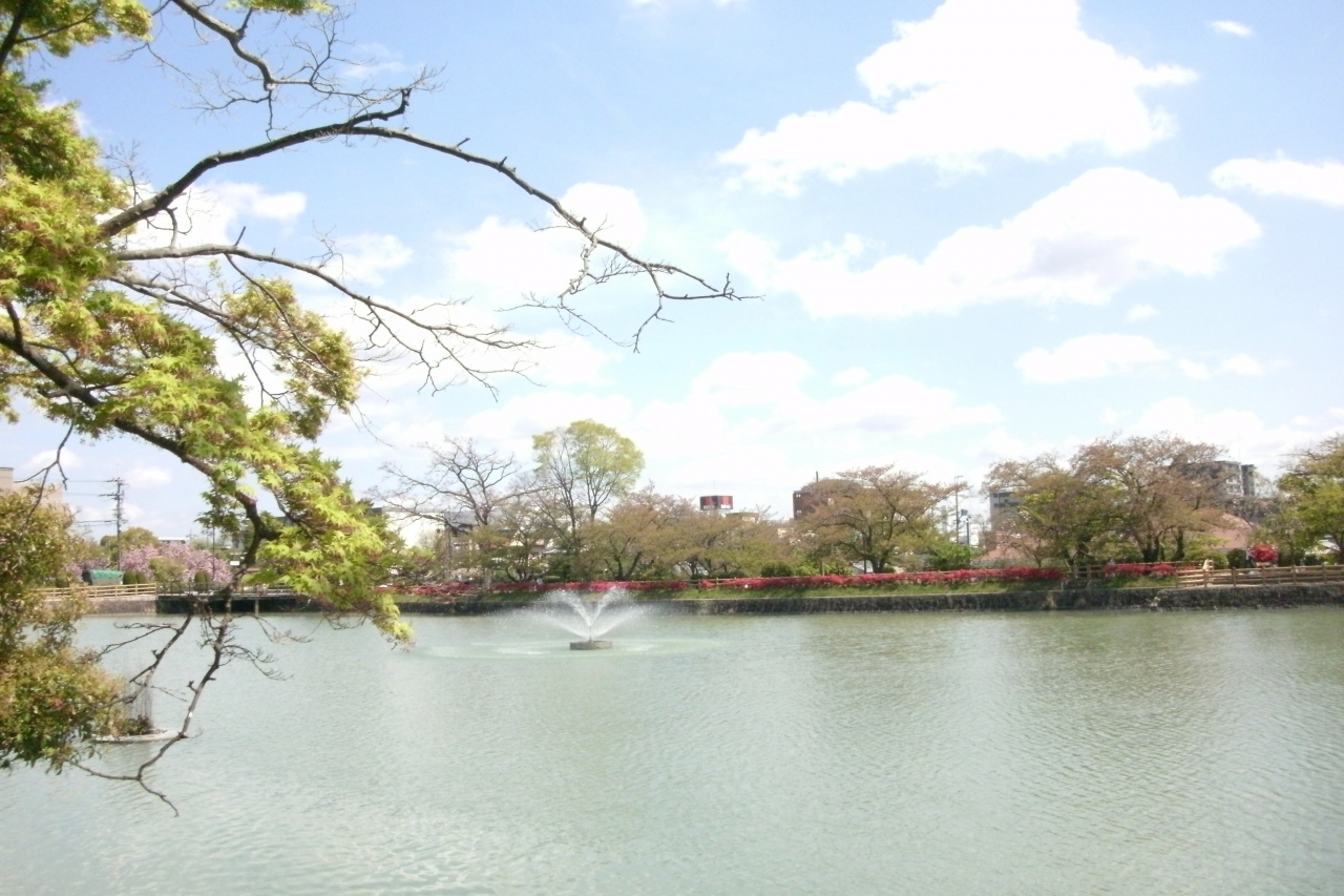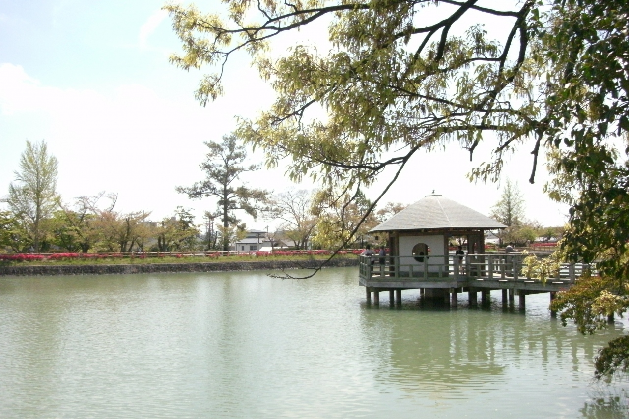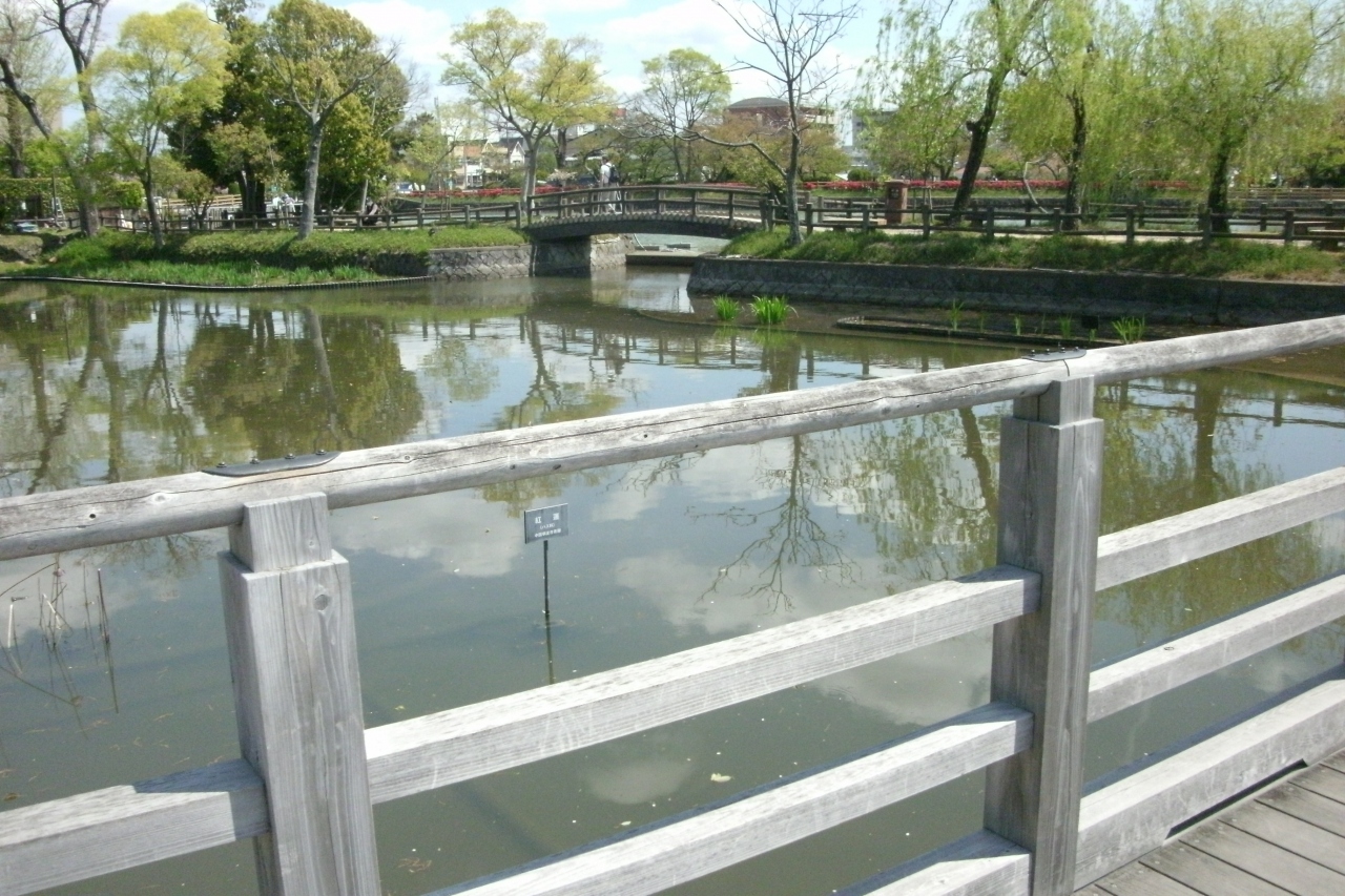 キリシマツツジが満開との新聞報道を見て出かけてみました。八条ケ池は長岡天満宮境内の東側に南北に細長く広がる池です。江戸時代に当地を領した八条宮智仁さまが寛永15年(1638年)にこの池を開いたことから名付けられたそうです。池の中央には中堤があり、北側には水上橋が架かっています。4月の上旬に行きましたが中堤の両側はキリシマツツジが真っ赤に咲いていてとても良かったです。