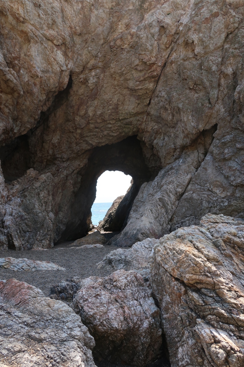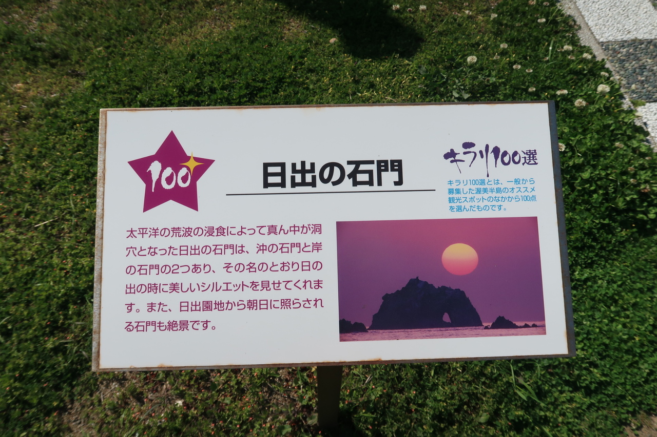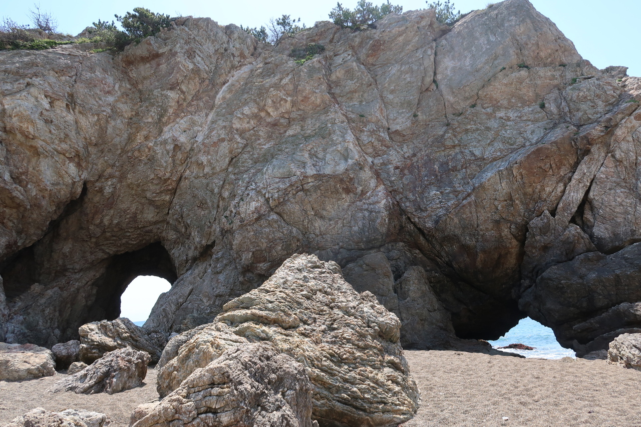 海の中でポッカリとおおきな穴をあけている不思議な岩「日出石門(ひいのせきもん)」。