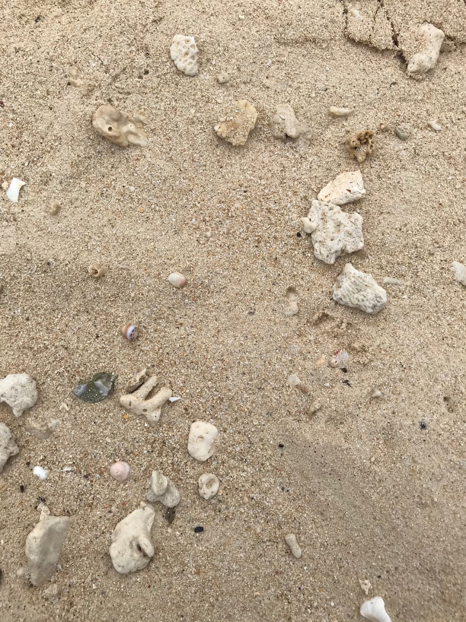 ビーチには珊瑚のかけらや貝殻、カニなどの生き物もいて、子どもも大喜びで遊べました。