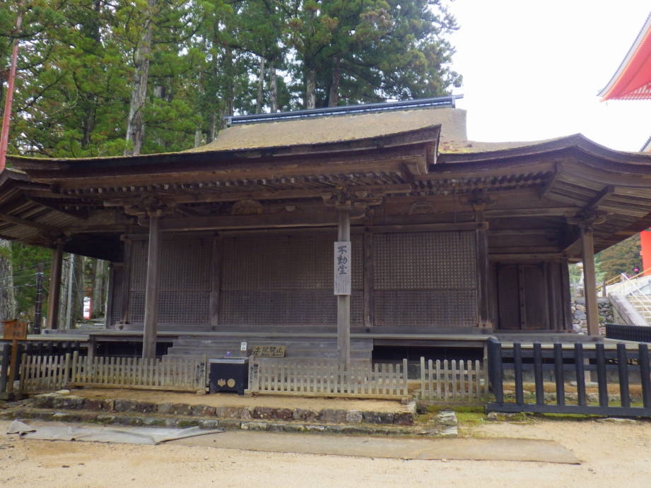 「根本大塔」を背に「金剛峯寺前駐車場」方向に戻っていくと、「不動堂」がありました。やもすると見逃しそうな地味な建物ですが、四人の工匠がそれぞれの随意に造ったため、お堂の四隅はすべて形が違っているのだそうです。