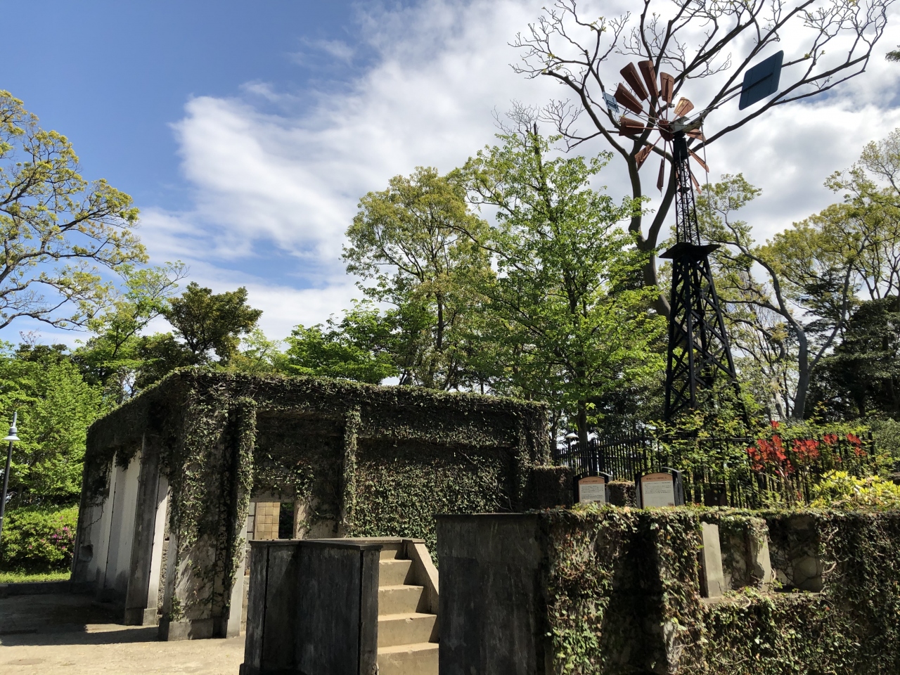 港も見える丘公園の北側(山下公園側)、フランス山地区の中心に、旧フランス領時間公邸の跡があります。建物の一部や階段、井戸などが残っていますが、建物の外壁の跡には、ツタの葉がからまっていて、廃墟の様です。この遺構の中に入って、内側から眺められるようになっています。