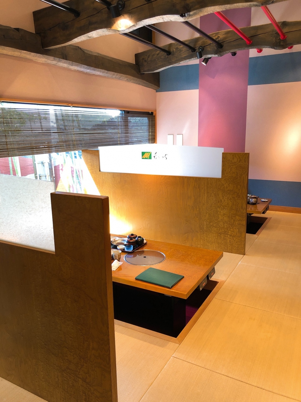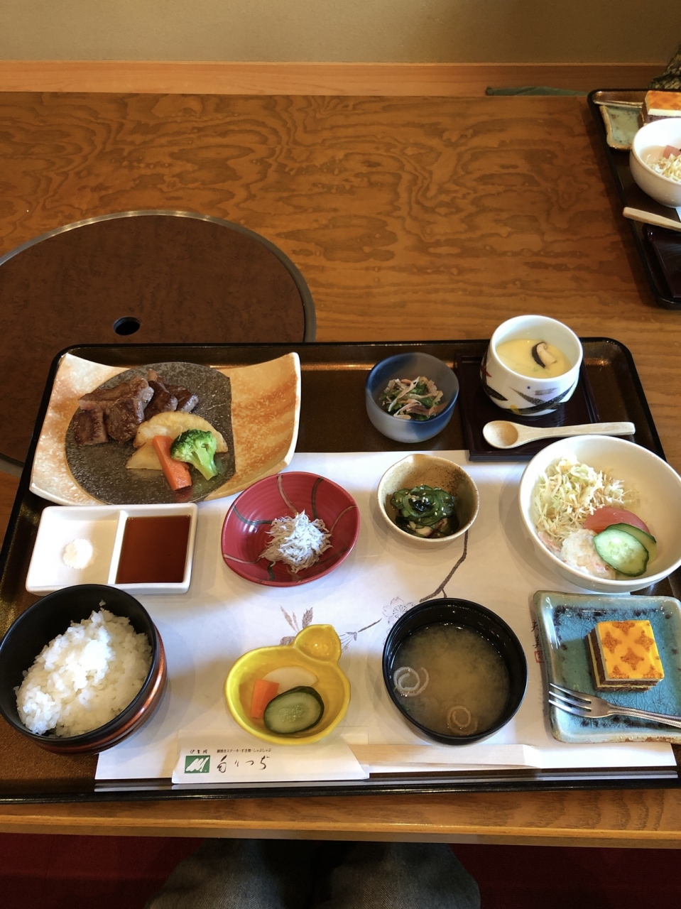 レストラン「もりつぢ」の前には伊賀牛を販売する肉店「森辻」、お肉屋さん直営なので期待大です。靴のロッカーが設置されているぐらい広く立派な店内、通された部屋も仕切りのある掘りごたつ式の和室でゆったりとしています。