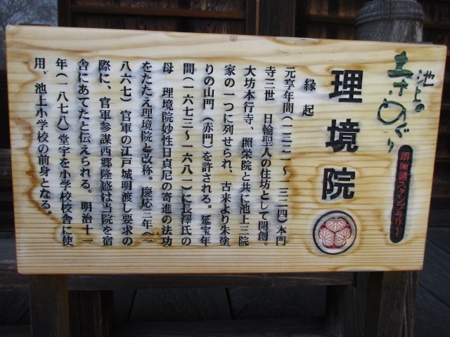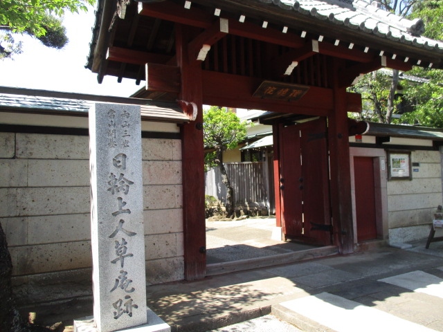 池上駅から池上本門寺へ向かう池上本門寺総門前参道の総門の加藤清正が寄進した長い石段を登る前の左側にある理境院に歩いて7分ぐらいで着きます。理境院は朱色門で池上本門寺の塔頭の雰囲気が漂ってます。境内に入ると一直線に参道が伸び右側に松が並び左側に緑の芝生が鮮やかで見事に整備され見ごたえありました。朱色門前の左に日輪上人草庵跡石碑が立っています。
