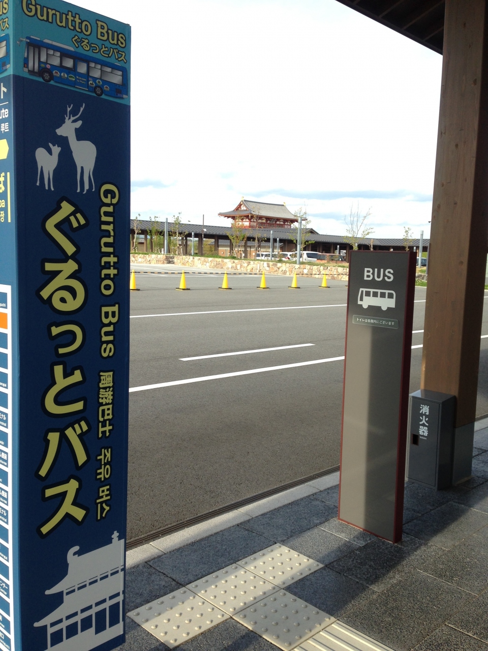 観光客向けに、観光地を巡って一回100円で乗れるバスです。近鉄奈良から平城京跡へ行くのに使いました。帰りのバス停を探していると、運転手さんは親切で“帰りのバス停は中に入ってバスターミナルからですよ”と教えてくれました。