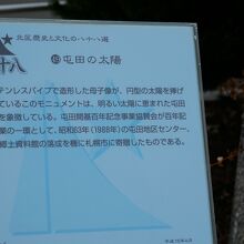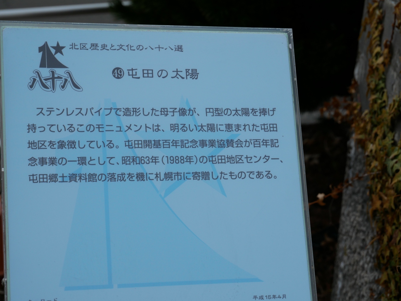 屯田郷土資料館前にあるモニュメントで、母子が円形の太陽を持っているのを表していますという解説版がありましたが、正直、よく分からない感じ。