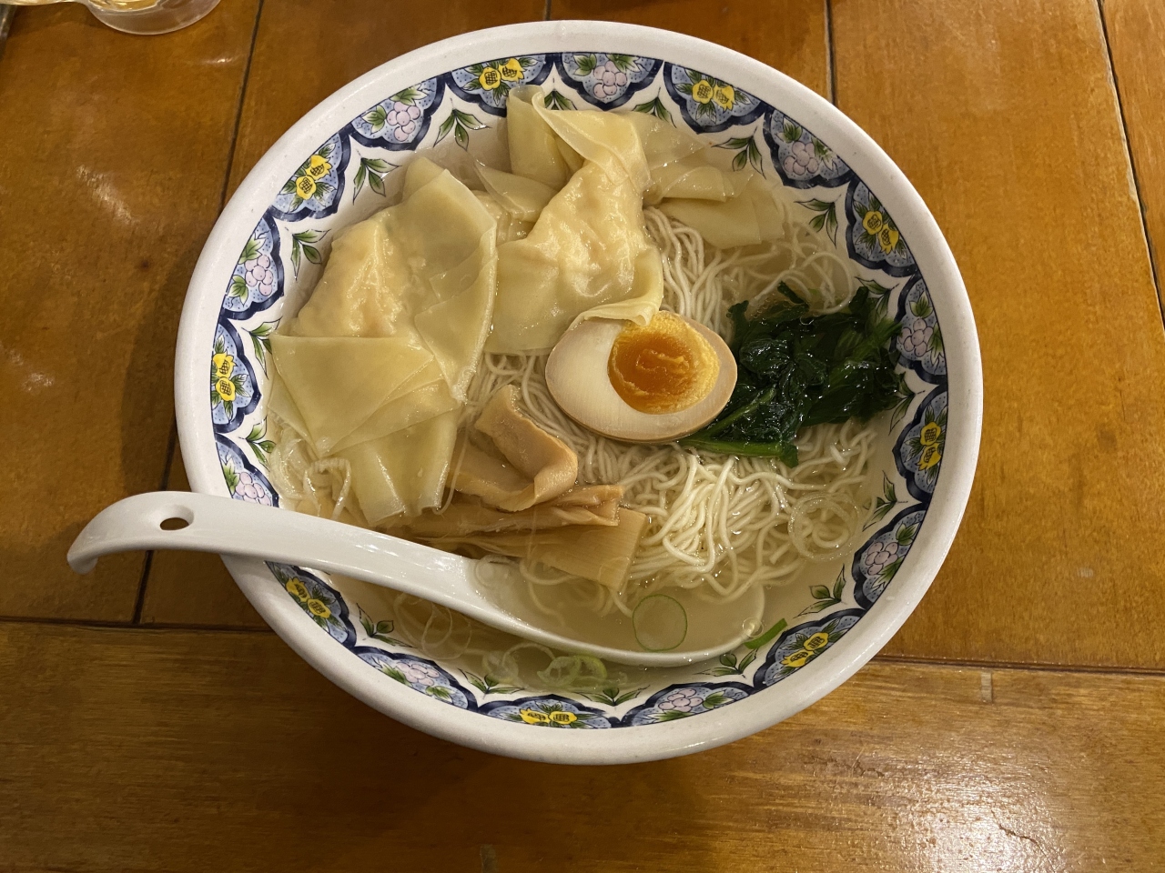 エビワンタン麺(970円)をいただきましたが、あっさりしたスープに細麺、海老ワンタンもおいしく満足でした。サービスの杏仁豆腐も期待を裏切りません。これで駐車場がもう少し何とかなれば・・