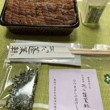 あの有名な蓬莱軒のひつまぶしを自宅で楽しめるデパ地下の売店です。今日は電話で予約しておいたので待たずに買う事が出来ましたが、タイミングによっては待ち時間がある様です。茶漬け用の出汁やワサビもセットされてます。