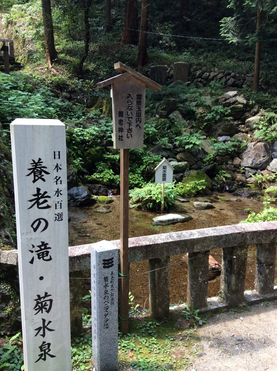 養老の滝の遊歩道近くにある養老神社の鳥居の手前に名水百選菊水泉の看板がありました、境内に入ると、思ったよりも大きい、泉というより池のようです、よく見ると底から水が湧いてきている事が分かります、飲んで見ると、流石名水です