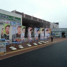 入口前には顔写真付きの選手の幟がいくつもはためいていました。