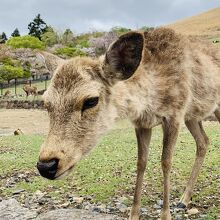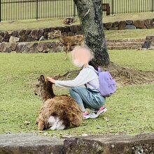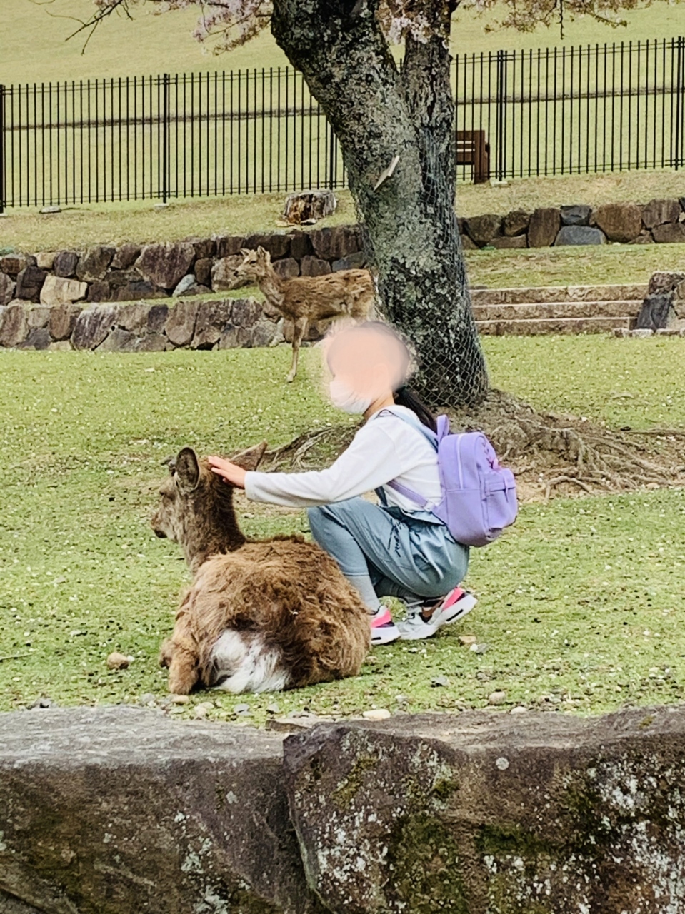 小学生くらいの女の子が 、シカの頭を なでなで していました。