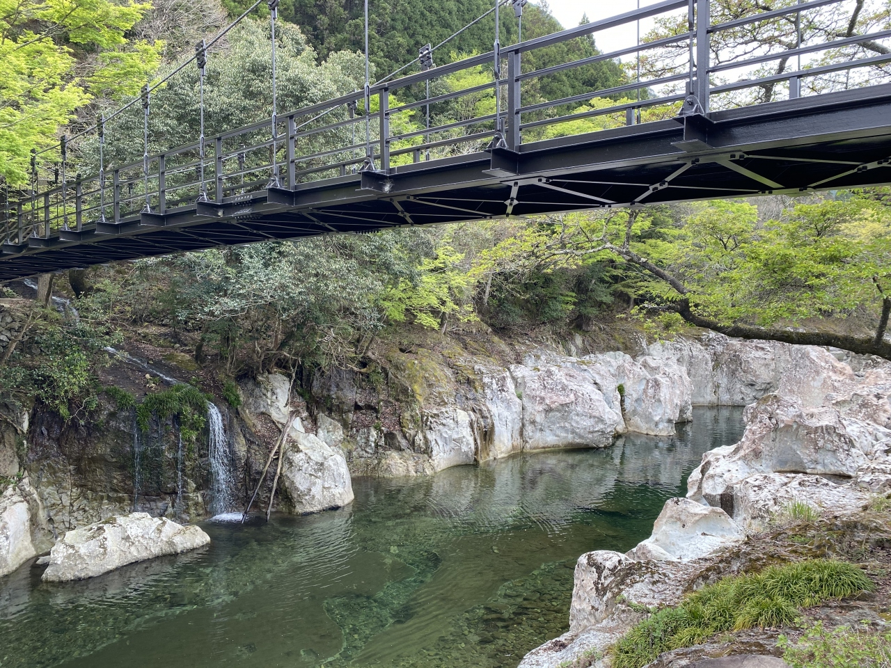 遊歩道も整備されていました。このあたりも一帯も耶馬溪に含まれるようでなので、めちゃ広範囲ですね。展望所までくだると、好き風な渓谷の風景がすぐに見えてきます。甌穴が発達して渓谷になったって、地球の営みは凄過ぎます。正面には滝のようなものが見えてきます。