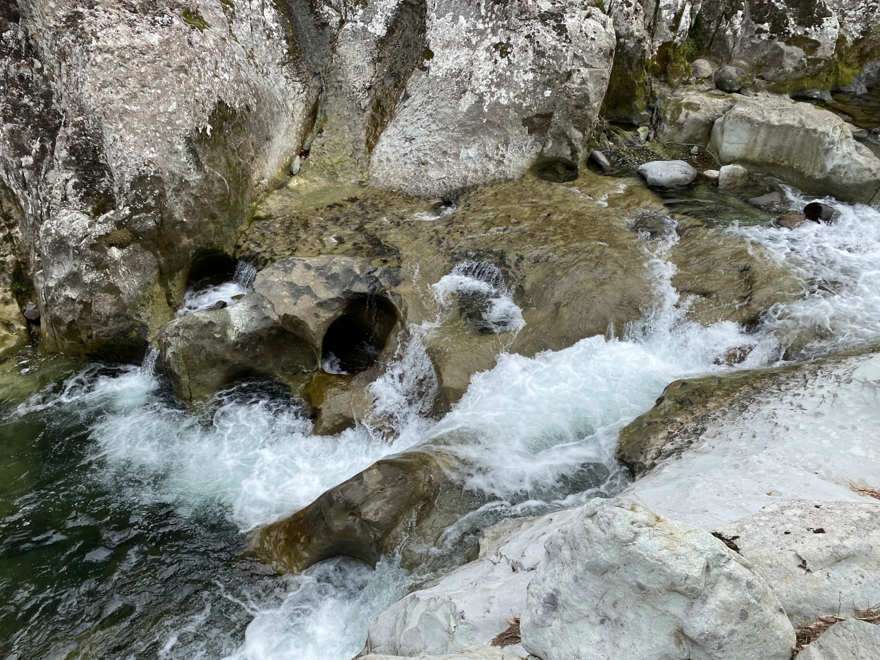 甌穴と甌穴の壁が流れでぶち壊され、この渓谷を形作って行ったようですが、どんだけ激流だったんでしょうかね。吊り橋の前後あたりが、一番「猿飛甌穴群」が見られます。甌穴が崩れた所でしょうか、断面が白っぽくなりました。