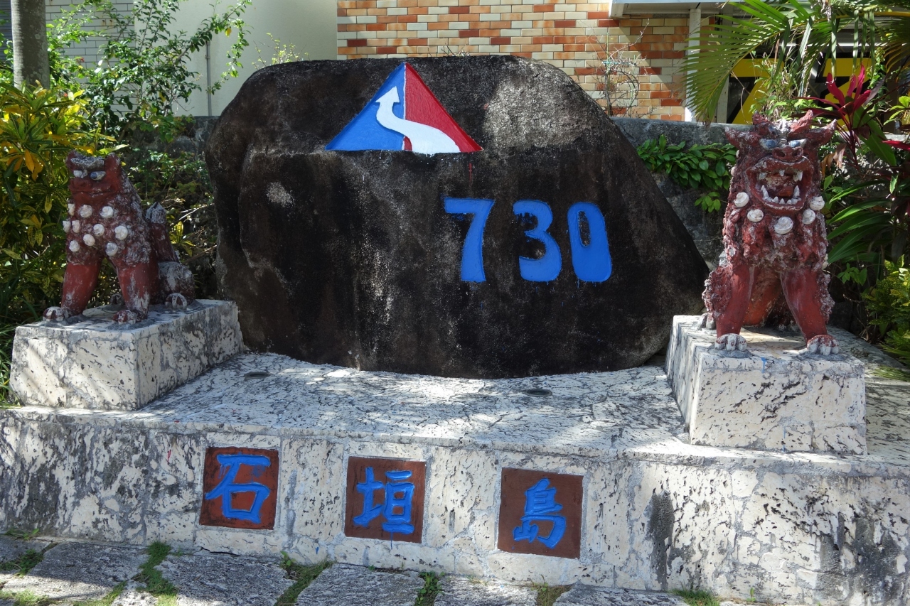 離島ターミナルからもバスターミナルからもすぐのスクランブル交差点で、石垣島で一番交通量の多い所だそうです。国道390号線の起点です。
