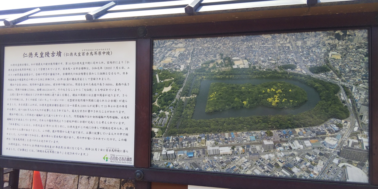仁徳天皇陵は堺市にある世界文化遺産「百舌鳥・古市古墳群」のひとつです。正面にあたる拝所には普段ボランティアガイドさんがいらっしゃいますが、コロナウイルスの影響かどうかわかりませんが、この日はいらっしゃいませんでした。歴史などいろいろ教えてくださるので、いらっしゃったら、ぜひお話を聞いてみてください。
