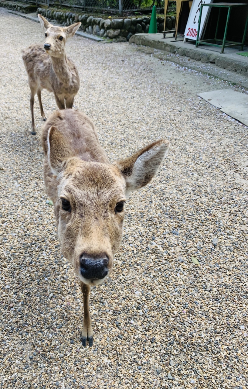境内にいる 可愛らしい シカ たち に おせんべい をあげながら…