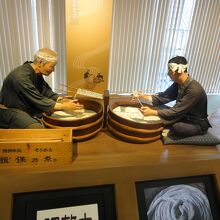 1階のエントランスでは1日に5回程、2本の棒に掛けられた約50cmの素麺を、分け箸を使って約160cmの長さに延ばすという、職人さんの妙技を目の前で見ることができ、希望者は体験もきるようになっています。