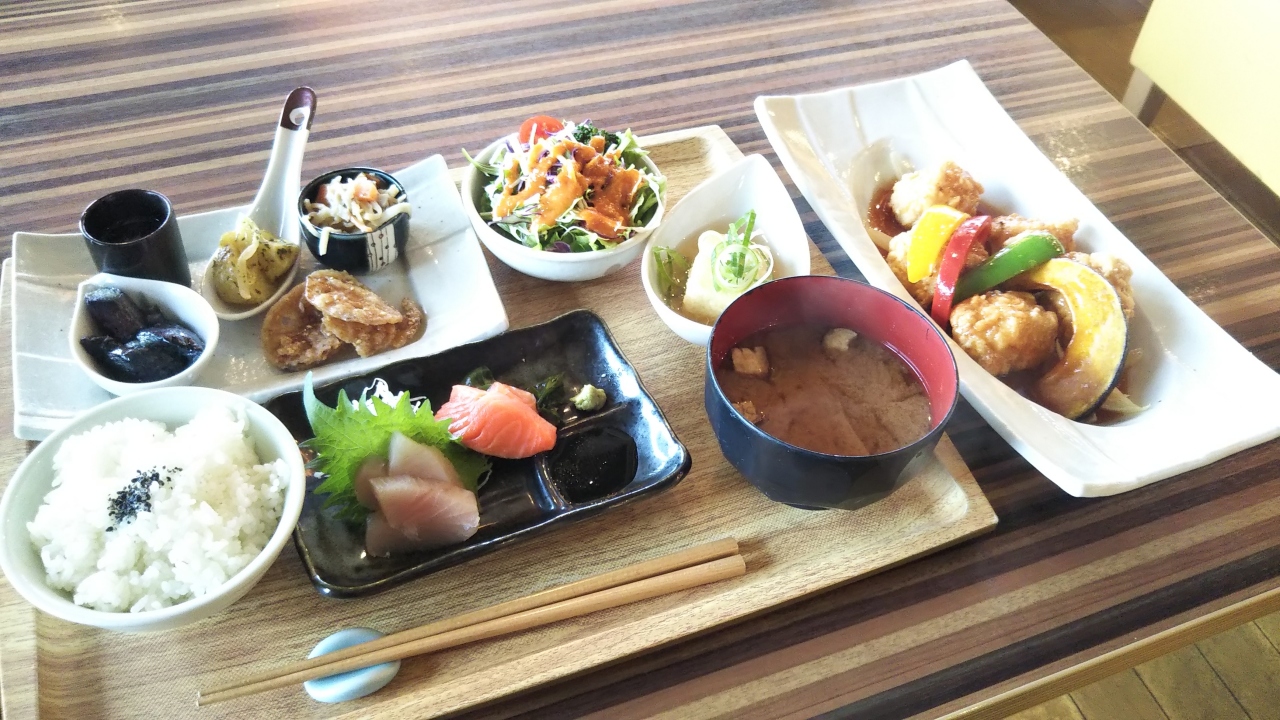 オーダーしたのは、阿波すだち鶏唐揚げ甘酢あん定食で、総菜膳+刺盛+唐揚げの甘酢あんかけ+ごはん+赤だし。