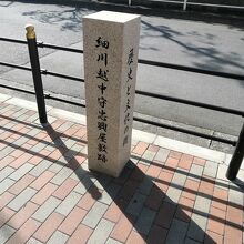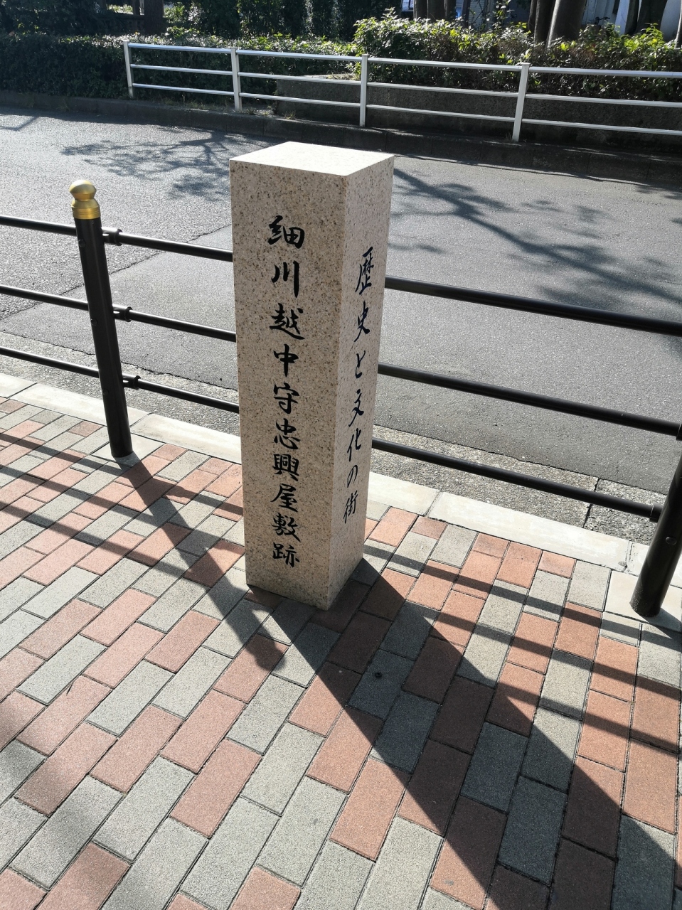 越中公園という小さな公園の西側の道路沿い北側にあります。この公園も当然細川忠興が越中守だったところからきているのでしょうね。正直ここには石碑しかないので細川忠興の屋敷の台所にあった井戸であった越中井とかの見学のほうがいいです。