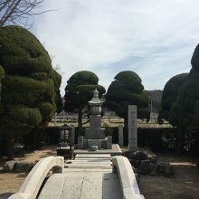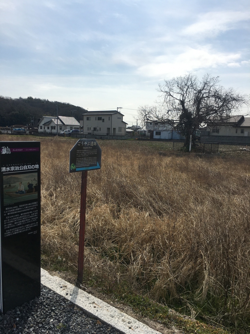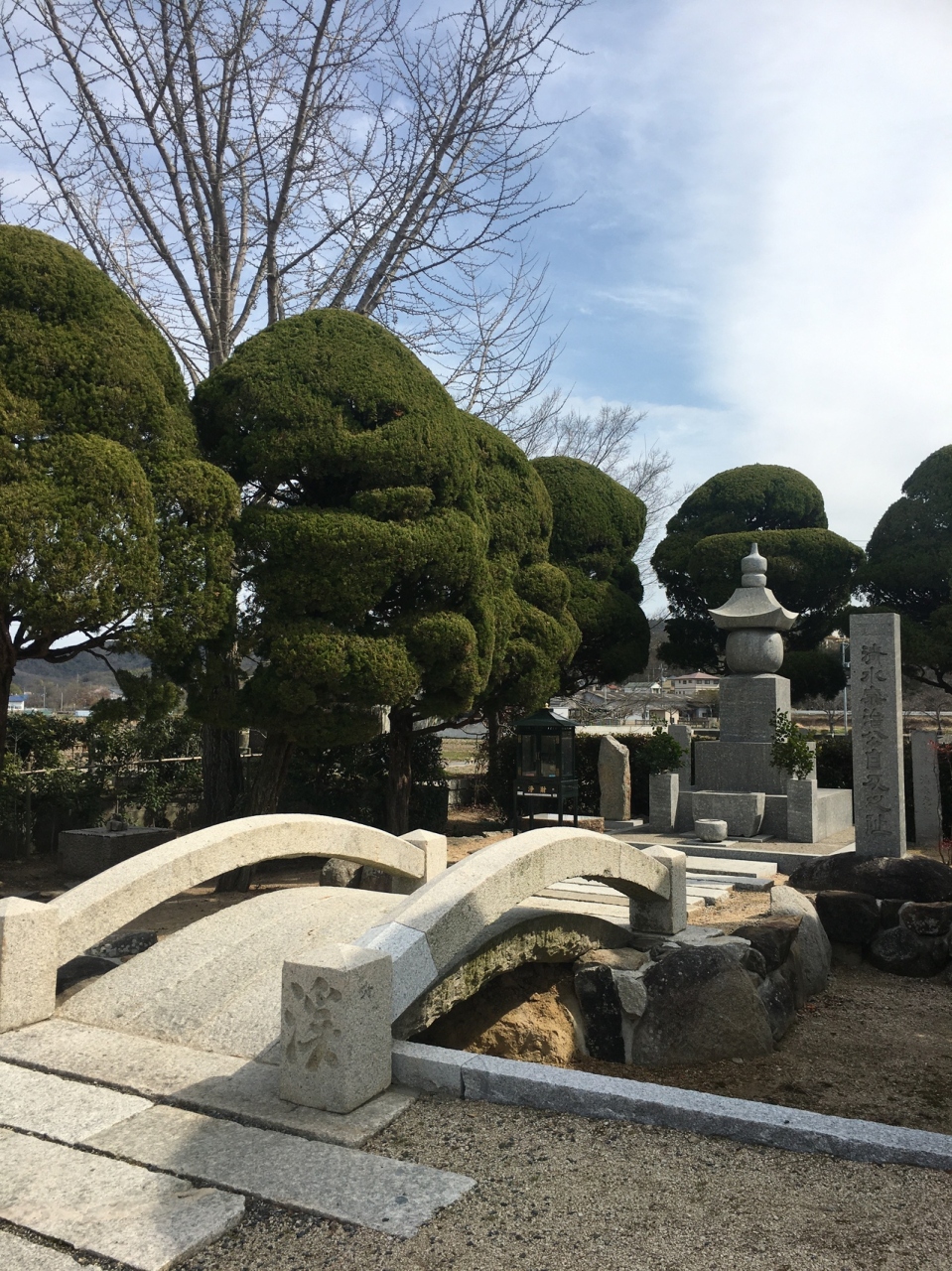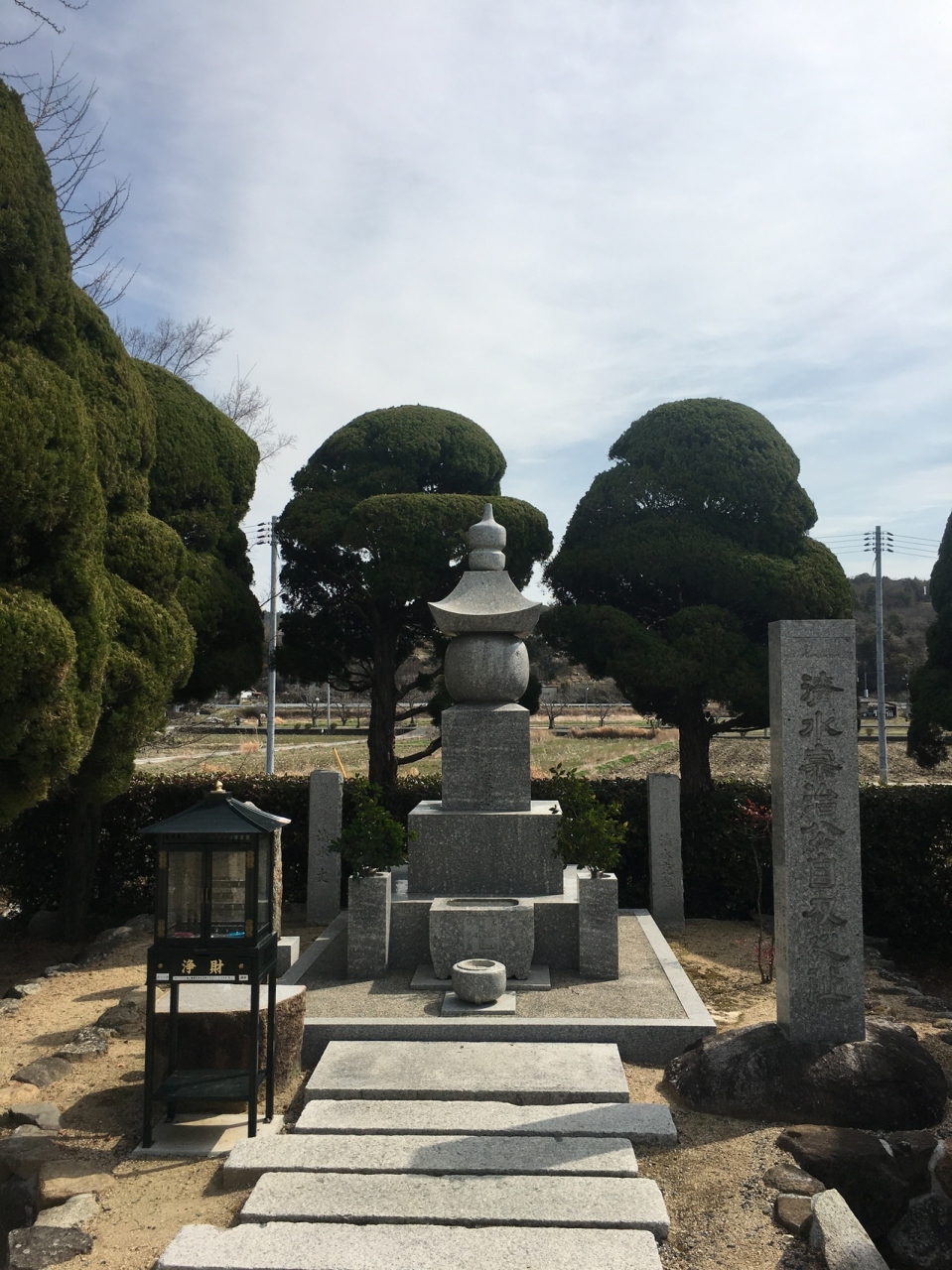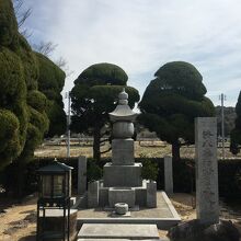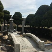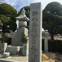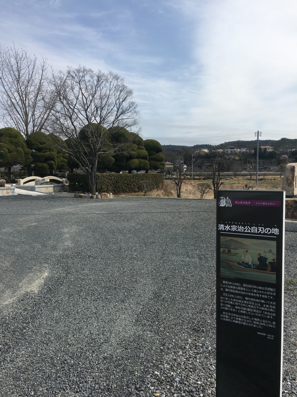 高松城址公園前の妙玄寺内にありました。説明看板には切腹前の船には乗っている絵が描かれていました。石碑や供養塔も建てられ立派な新しいものでした。供養塔の周りは綺麗な松で囲ってあり、川は流れてないですが丸みを帯びた橋があります。