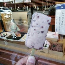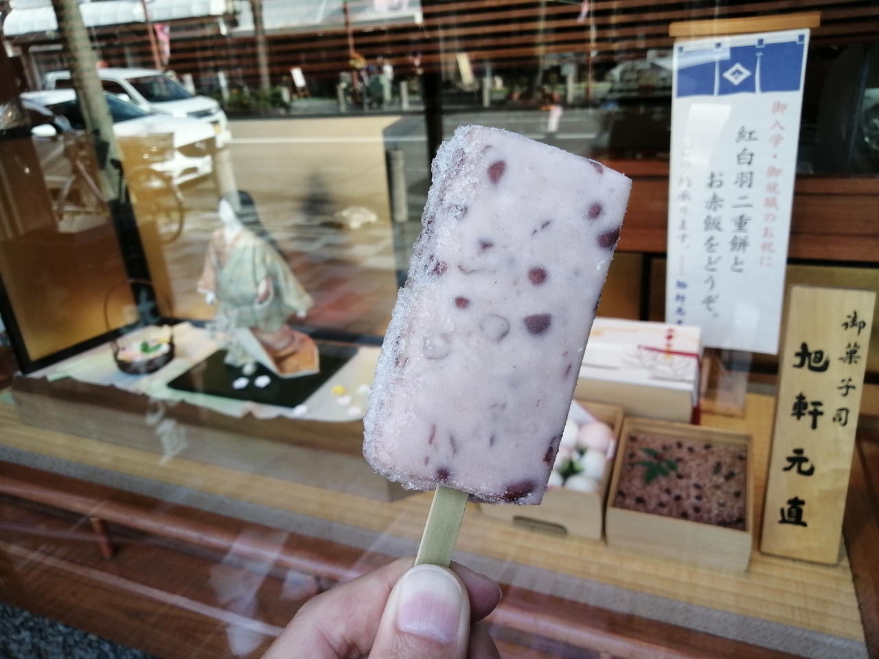 「地元素材を使ったもっちり食感の和風アイスバー」をいただきました。長い名前ですが要は「くずバー」です。“くずきり”を凍らせたものです。近所の和菓子屋に2軒立ち寄りましたがまだシーズン前ということで販売していませんでした。旭軒元直さんで出会えてラッキー!6種類の中から「ミルクぜんざい」(税別各180円)をチョイス。しかし、このくずバーなるものを食べるのが初体験…。