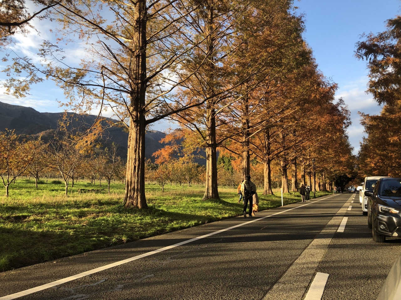 遠景の山々とのコントラストと一直線の並木道は圧巻でした。