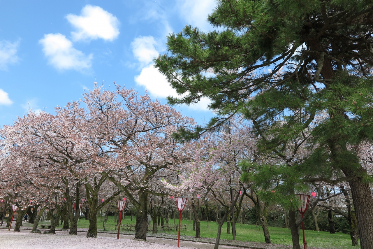 無料の駐車場があります。とてお広い公園です。ちょうど、桜の時期散りかけの時期でしたが、満開だとすごいだろうな、と思うぐらいたくさん桜の木が植えてありました。出店も出るようです。桜名所100選に選ばれている事だけの事はあります。