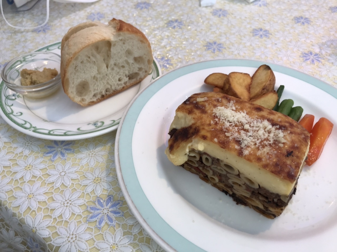 関内駅近くにあるギリシャ料理店です。一人でも入りやすい雰囲気だったのでランチを摂りました。サラダ、トマトスープの後、パスティチョをいただきます。パスティチョは見た目がムサカと変わらないのですが、中身が違うようで、パスタが中心です。バケットには豆のペーストを塗って食べるところもギリシャらしさかと。