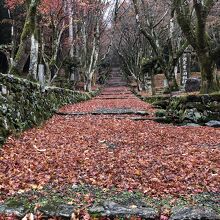駐車場からのどかな山道、紅葉の絨毯、長い階段、そして風情のある寺院。