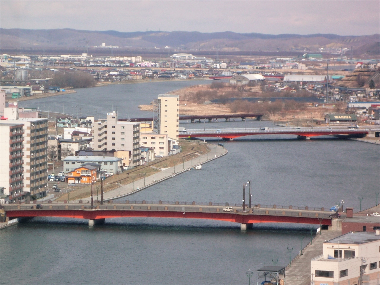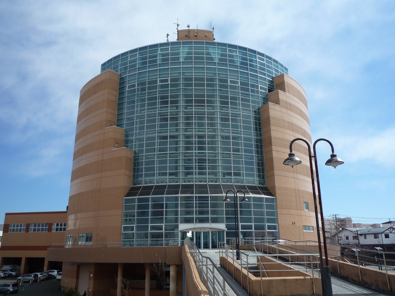 幣舞橋を渡って正面に観えるロータリーの時計の上に立つガラス張りの10階建ての建物が「釧路市生涯学習センターまなぼっと」で、その最上階に在るのが展望台です。